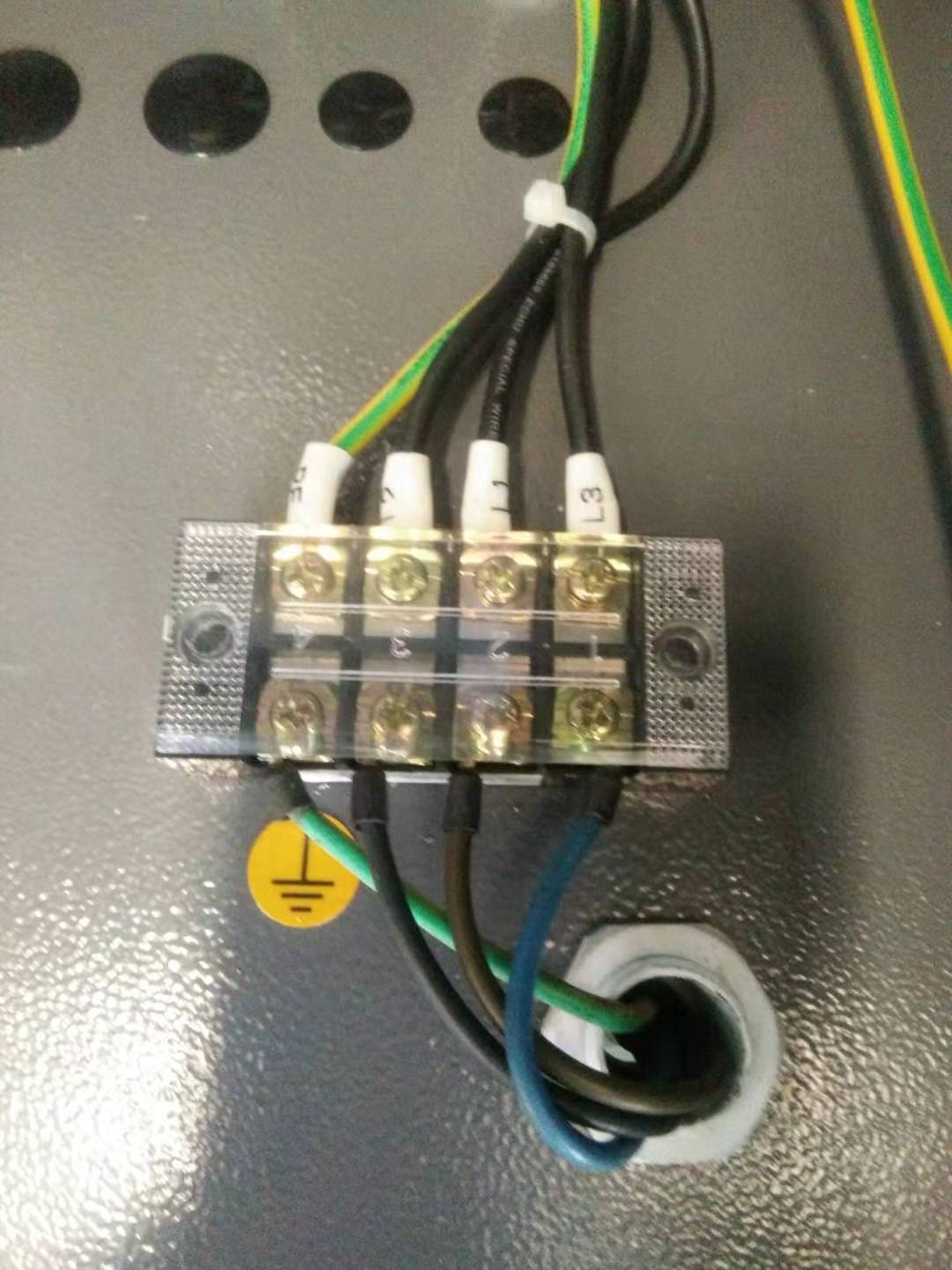 2、數(shù)控機(jī)床的通電:機(jī)床一般使用三根動(dòng)力線380V,一根接地保護(hù)線,要注意電纜線的平方數(shù),在機(jī)床說明書的線路圖中都有明確標(biāo)注。例:CAK6130h要求單根2.5平方毫米,電壓380V±10%,如果電壓太低將會導(dǎo)致主軸旋轉(zhuǎn)不穩(wěn)定。