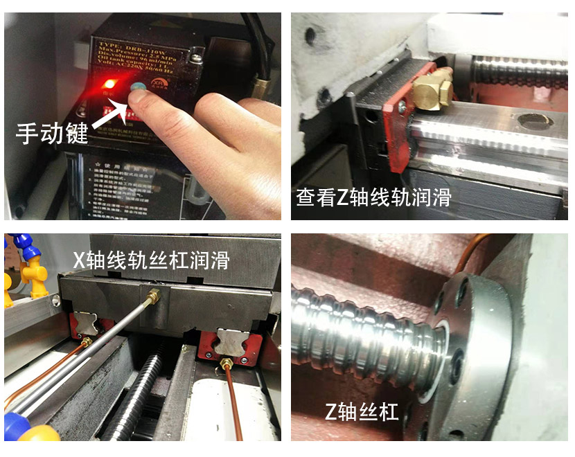 4、清理完成后,按住油泵手動鍵注油10-20秒,如下圖所示,查看各潤滑點(diǎn)是否有潤滑油滲出。如果沒有滲出,應(yīng)檢查主油管或計量件。